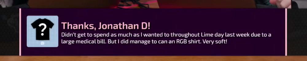 large medical bill. But I did manage to can an RGB shirt. Very soft! | Timestamp |  |