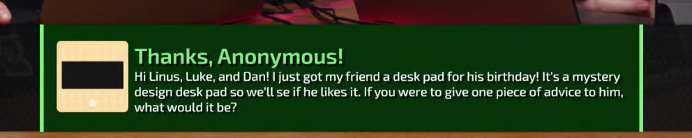 Hi Linus, Luke, and Dan! I just got my friend a desk pad for his birthday! It's a mystery