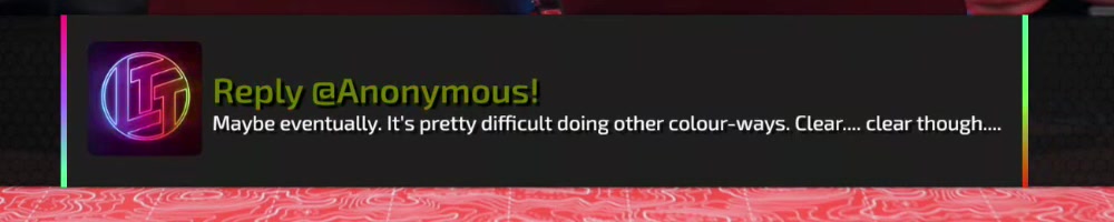 Maybe eventually. It's pretty difficult doing other colour-ways. Clear.... clear though.... | Timestamp |  |