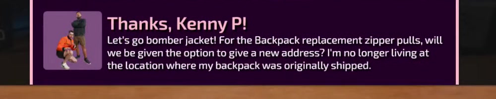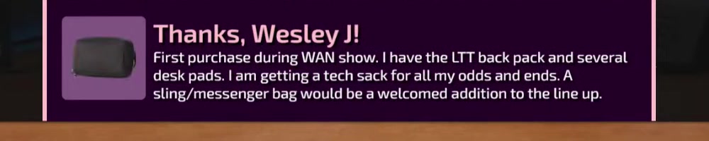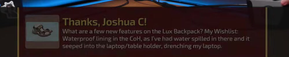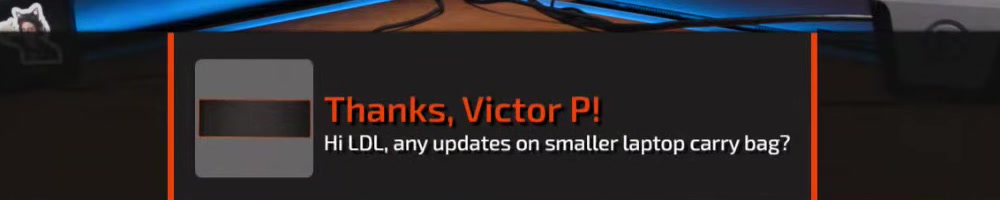 Hi LDL, any updates on smaller laptop carry bag? | Timestamp |  |