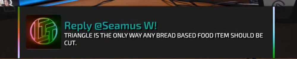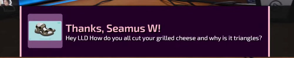 Hey LLD How do you all cut your grilled cheese and why is it triangles? | Timestamp |  |