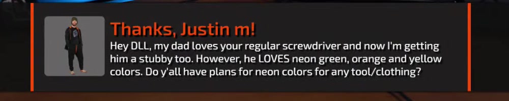 colors. Do y'all have plans for neon colors for any tool/clothing? | Timestamp |  |