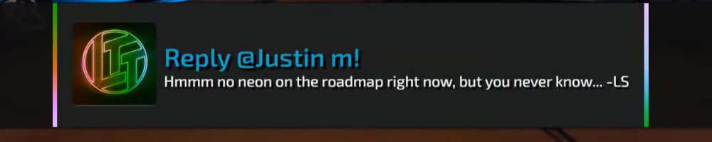 Hmmm no neon on the roadmap right now, but you never know... -LS | Timestamp |  |