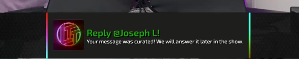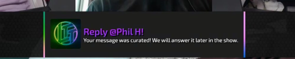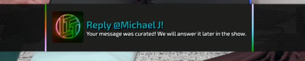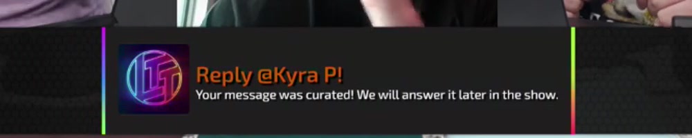 Your message was curated! We will answer it later in the show. | Timestamp |  |