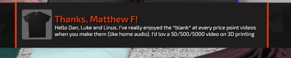 Hello Dan, Luke and Linus. I've really enjoyed the *blank* at every price point videos