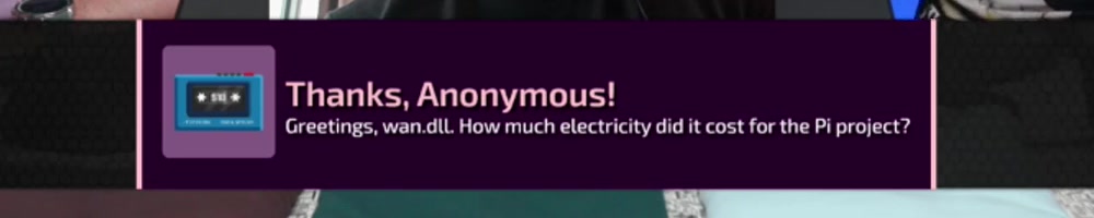 Greetings, wan.dll. How much electricity did it cost for the Pi project? | Timestamp |  |