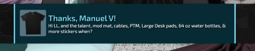 Hi LL, and the talent, mod mat, cables, PTM, Large Desk pads, 64 oz water bottles, &